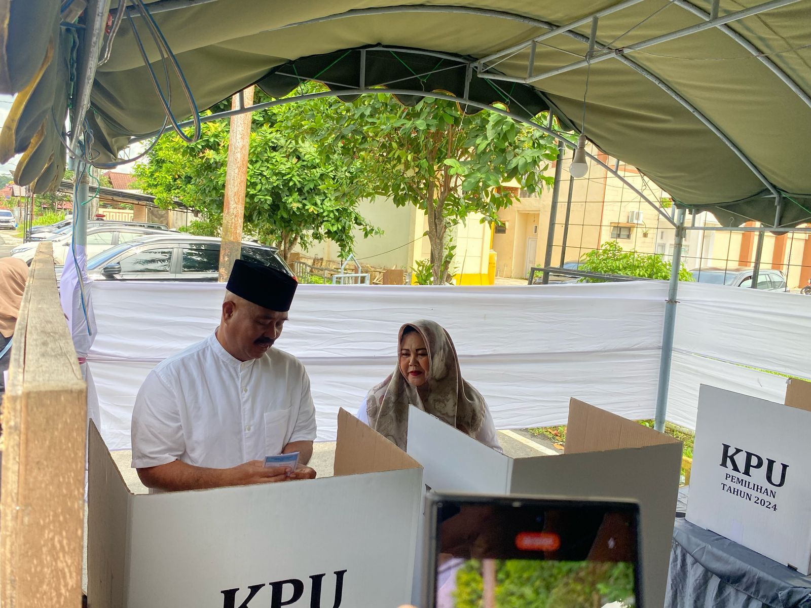 Didampingi Istri, Edi mencoblos di TPS 22, Kelurahan Timbau, yang berlokasi di Perumahan Arwana, Tenggarong.