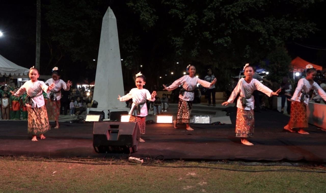 Suasana malam di depan Museum Mulawarman berubah menjadi panggung terbuka yang semarak. Sorotan lampu menari di antara gerak lincah para penari dan alunan musik daerah yang membangkitkan nostalgia budaya Kutai.